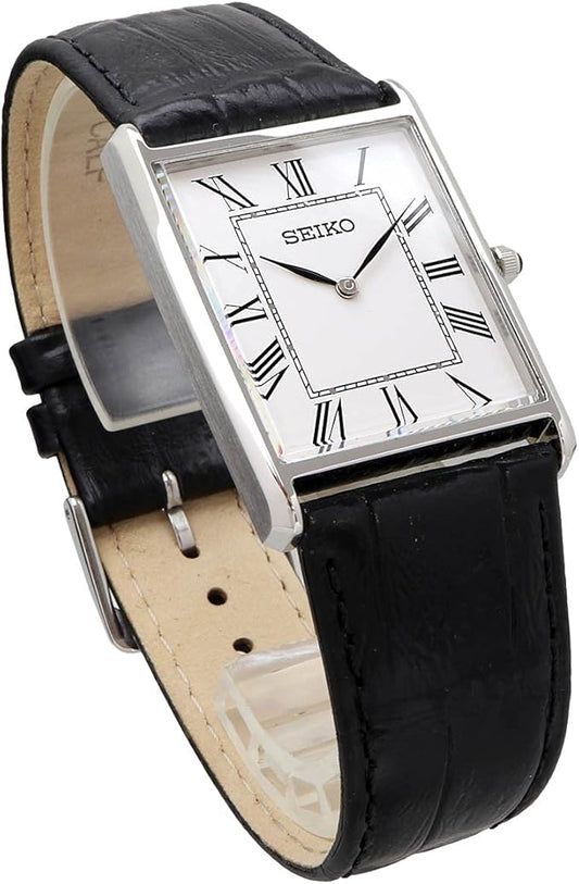 Seiko SWR049 Men's Wristwatch, Square Design, Quartz, White Dial x Black Leather Band, Classic