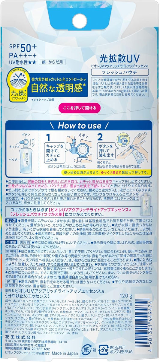 Biore SPF50 UV Aquarich Light Up Essence Fresh Pouch, 4.2 oz (120 g), Sunscreen