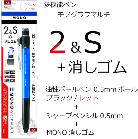 Tombow Pencil Multi-functional Pen 2&S with Eraser, Mono Graph Multi Pen, Bule