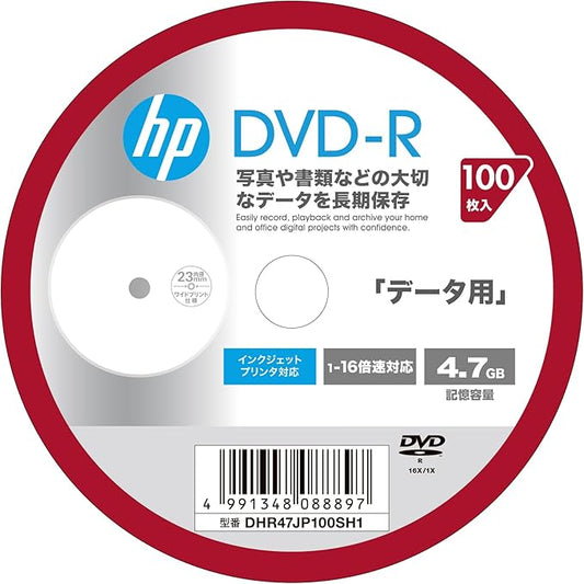 VERBATIM Hewlett Packard (HP) DHR47JP100SH1 Single Record DVD-R 4.7GB 100 Sheets Inkjet Printer Compatible, White, 1-16x, Single Side, Single Layer