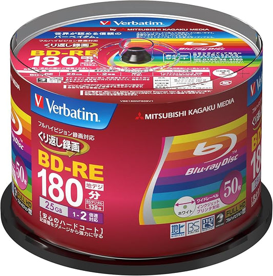 Verbatim Japan VBR13 Blu-ray Disc for Repeated Recording, BD-RE, 25 GB, 50 Cards, White Printerable, 1 Layer, 1-2 Time, VBE130NP50SV1 + Single Recording, BD-R, 25 GB, 50 Cards, White Printerable, 1