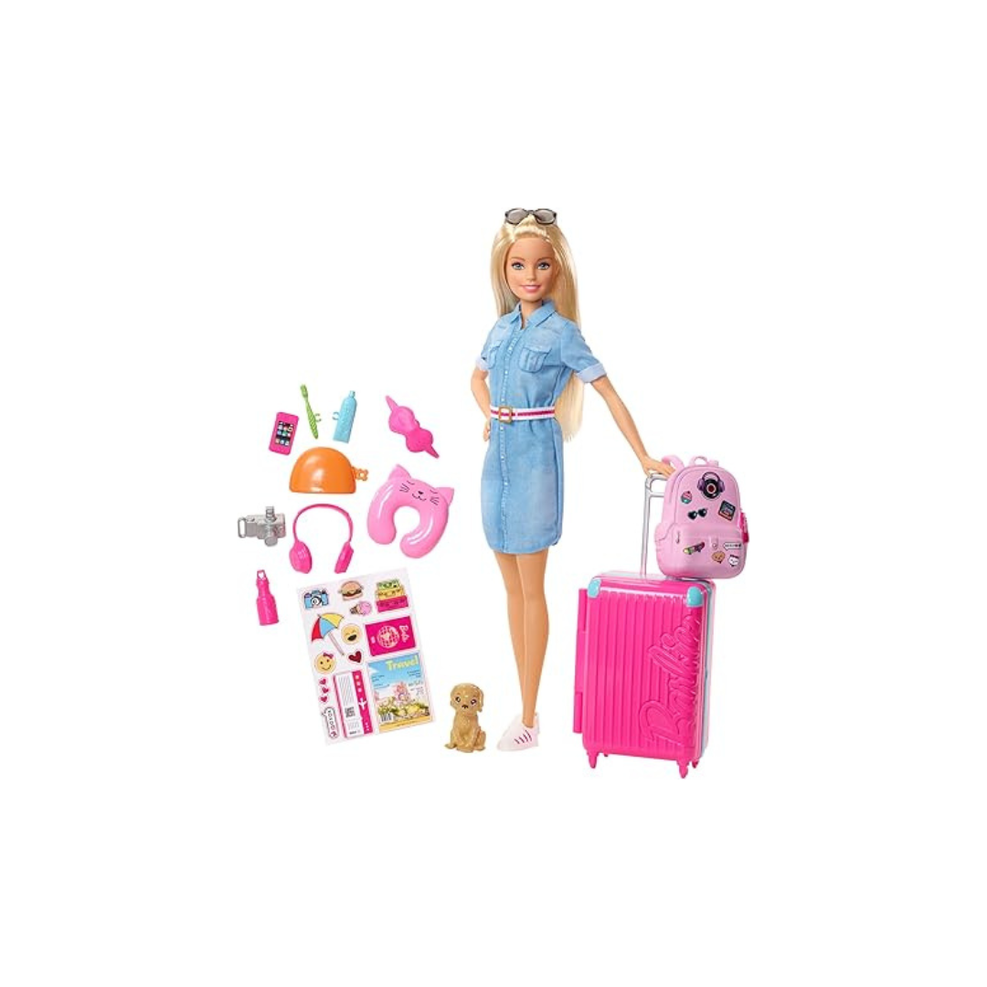 - Barbie wears a denim dress that was worn when it appeared in "Barbie Dreamhouse Adventure". You are ready for travel with sneakers that move around easily on your feet. Take your pup with you and carry your travel essentials like your cell phone, eye mask, neck pillow, headphones in a pink suitcase or backpack. You can hang your sunglasses to capture attractions with the camera, refresh with a toothbrush and toothpaste, and enjoy imaginations of various scenes on your journey. Includes sticker sheets to decorate your suitcase or record your travel memories. Shoes Type(shoes): Flat x Flat