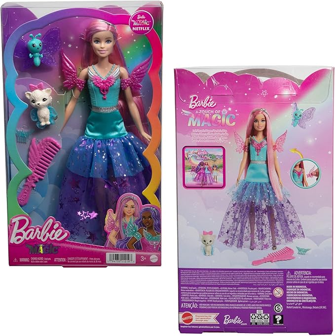 - A fantasy long hair Barbie inspired by the Barbie anime Barbie Barbie Touch of Magic. She wears a layered dress with wings accents on the chest, a long tulle skirt with stars and wings on the arm cuffs for a magical fashion. You can play hair with the included brush and hair accessories for long pink hair. Take two cute pets and start your adventure