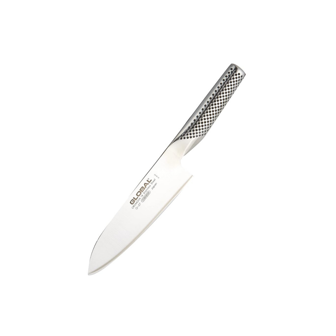 Compact Santoku Knife: The 16cm (6 1/4-inch) Global G-57 Santoku Hawatari Knife features a versatile, compact blade perfect for slicing, dicing, and chopping a variety of ingredients with precision.