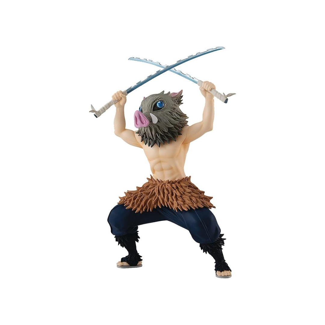Dynamic Pose: Inosuke Kuzuheira is captured mid-action with his signature boar mask and dual swords, showcasing his wild, fierce personality in a dynamic pose that fans of Demon Slayer will appreciate.