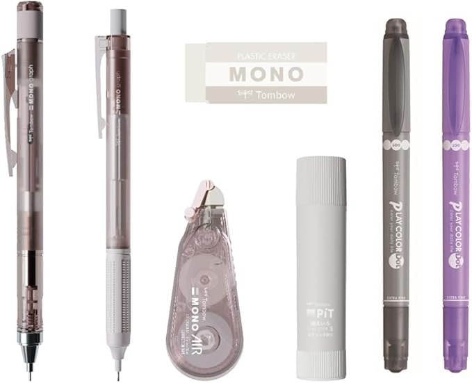 - Set Contents: 1 Mechanical Pencil, Monogram (0.5 mm), 2) Mechanical Pencil, Monogram Light (0.5 mm), 3) Eraser, MONO (Width 0.9 inches (23 mm) x Total Length 2.2 inches (55 mm), 4) Stick Glue Color Pit S (Capacity 0.4 oz (10 g), 5 Correction Tape, Mono Air (5 mm Width 32 mm x 10 m), 6) Water Based Marker Play Color Dots (5 m)