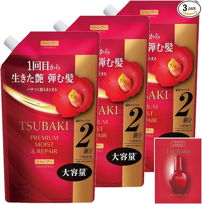 TSUBAKI Shampoo Refill, 20.3 fl oz (600 ml) x 3 + Special [Premium Moist & Repair] Glossy, Oil Force, Moisturizing, Bulk Drying, UV Ray
